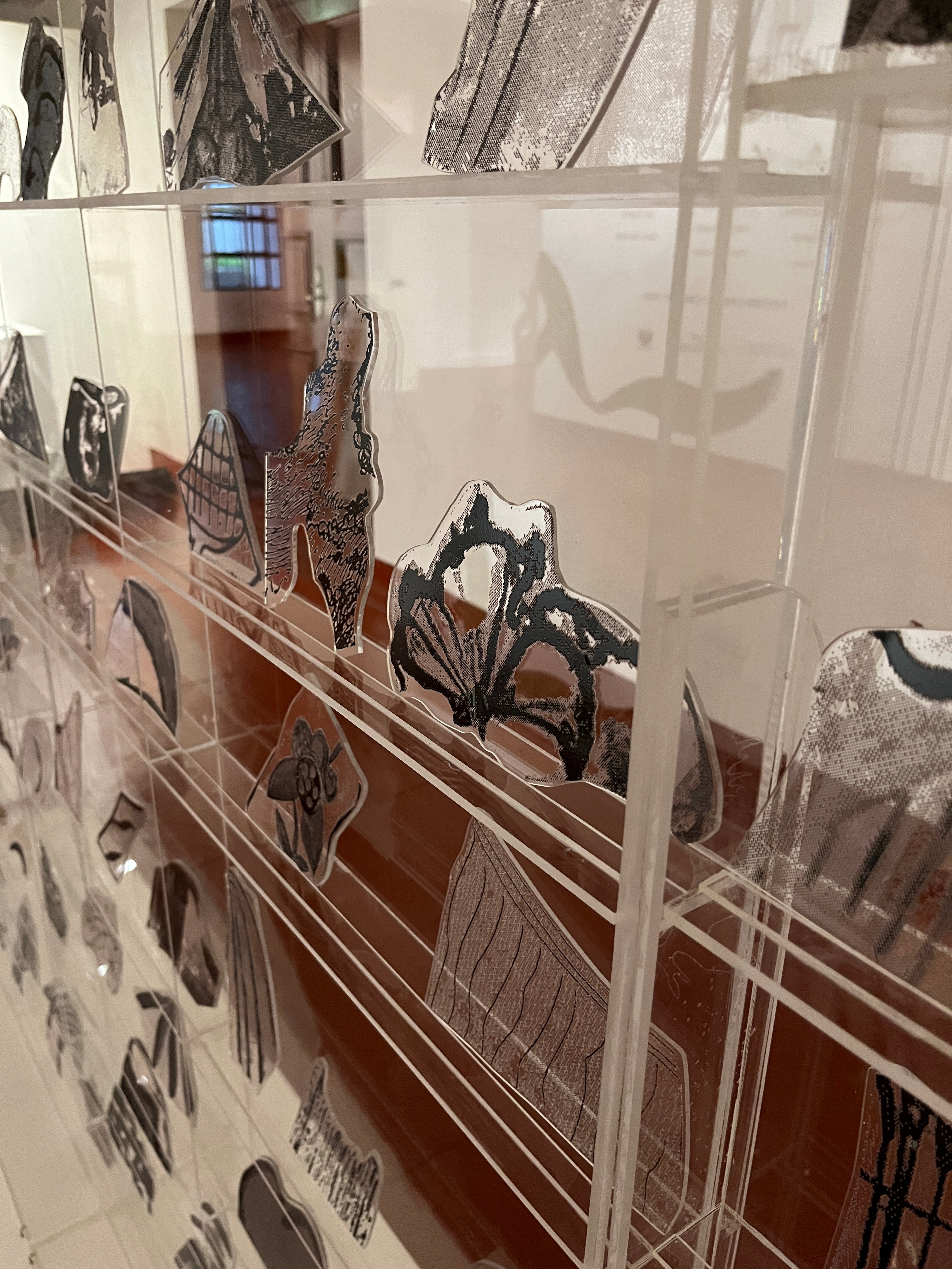 The acrylic catches light and shadow, folds and overlaps, creating layers that both conceal and reveal. Each piece invites careful looking, a pause, a moment of reflection. Arranged in a grid, the fragments create a rhythm that comforts while leaving space for wandering, for discovery. There is no single story here—only traces, whispers, echoes of domestic labor, archival practice, and acts of care, preserved in material form.