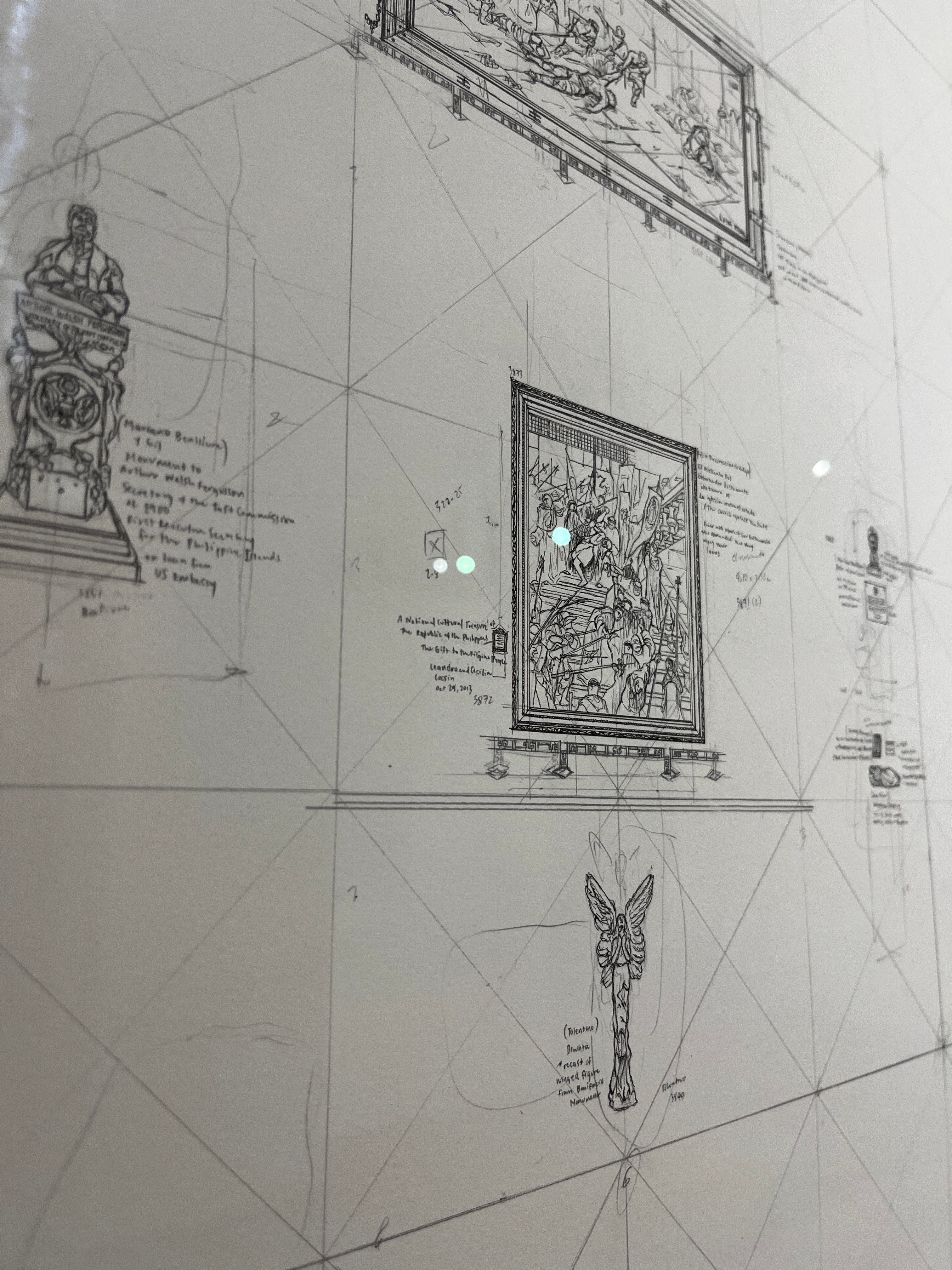 At the center, a lamb on a clay brick plinth recalls religious sacrifice. But instead of redemption, it offers accusations. Around it, ropes descend in a triangulated array, suggesting both divine light and constriction. Chalk outlines trace absence like crime scenes, forcing the viewer to confront aftermath rather than spectacle.