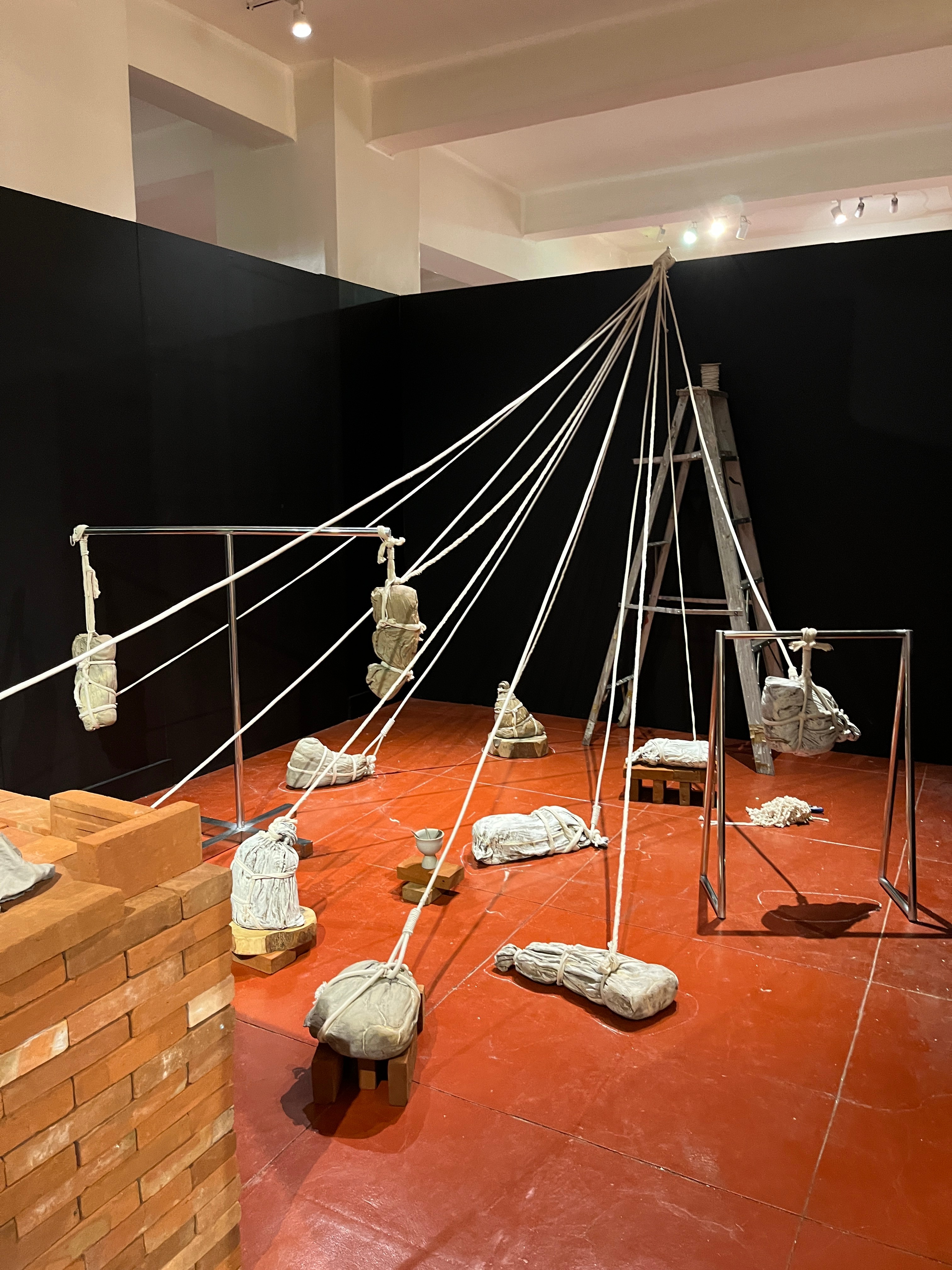 Ella Mendoza, Comfort of Contradiction, Stoneware, cotton rope, steel, terracotta bricks, 2025