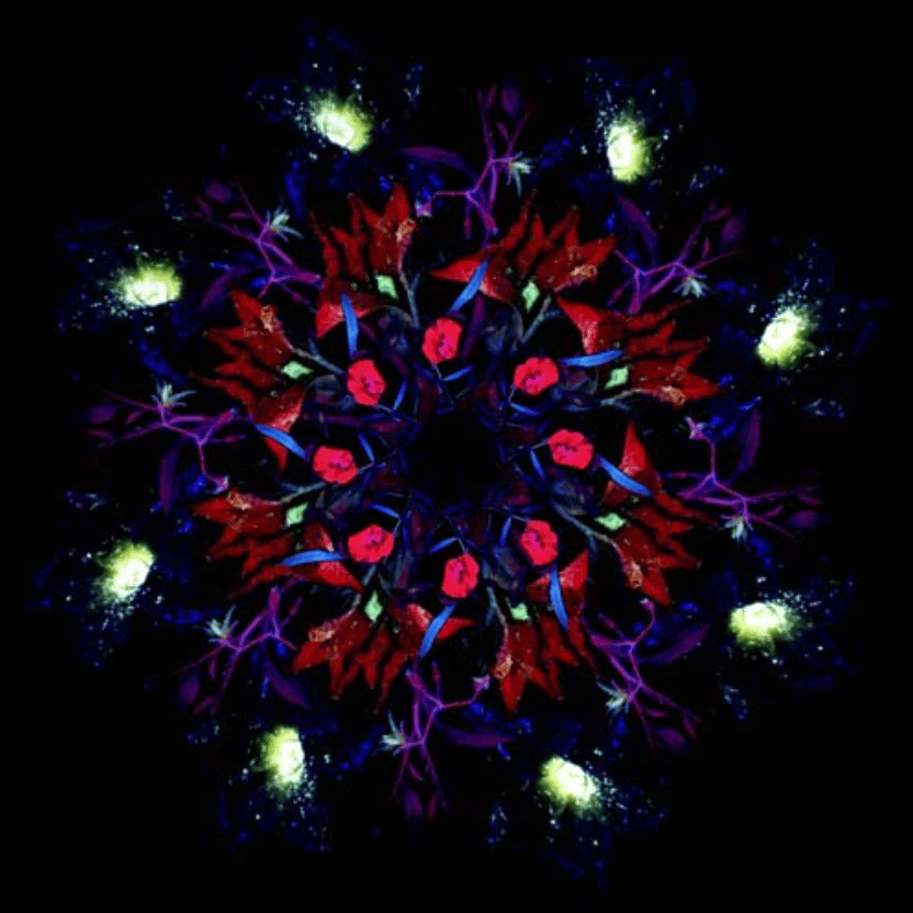 Issay Rodriguez, Cosmic Garden, collage of vegetable flowers photographed in UVIVF, 122 x 122 cm, 2022
