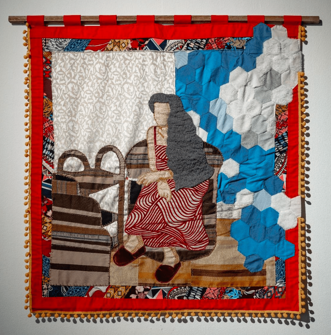 Tekla Tamoria, Sa may kanto nagkakape, tapestry, 97.7 x 90.1 cm, 2020